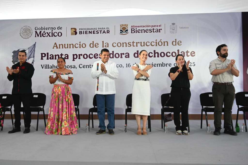 Villahermosa, Tabasco., 20 de noviembre de 2025.- En Villahermosa, Tabasco, la Presidenta Claudia Sheinbaum Pardo, anunció la construcción de la primera Planta procesadora de Chocolate Bienestar, que tendrá una inversión inicial de 80 millones de pesos (mdp) y permitirá consolidar a la entidad como la productora del mejor chocolate del mundo.