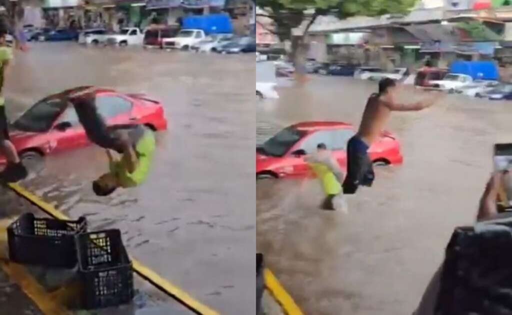Guadalajara, 20 de Agosto de 2025.- Locatarios del Mercado de Abastos de Guadalajara aprovecharon las inundaciones ocasionadas por las fuertes lluvias de este miércoles 20 de agosto para armar una competencia de clavados.