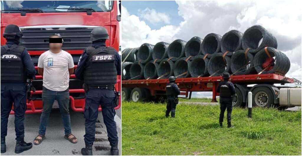 Durante la maniobra evasiva, el operador trató de impactar la unidad policial. Los integrantes de las FSPE lograron detener el vehículo y confirmar que transportaba 18 rollos de alambrón, con un peso aproximado de 32 toneladas y un valor de 1.9 millones de pesos, sin que el conductor pudiera acreditar su legal posesión ni presentar documentación del acoplado.