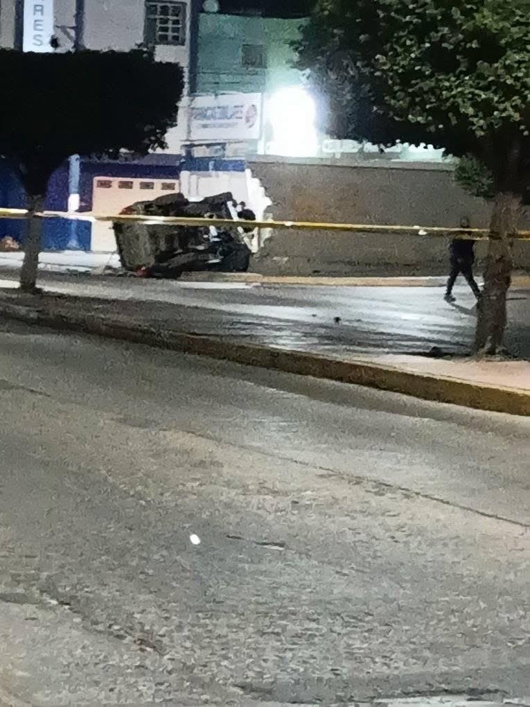 Los hechos ocurrieron frente a la tienda Bodega Aurrera, donde una camioneta terminó volcada e impactada contra el muro perimetral del establecimiento tras recibir múltiples disparos de sujetos desconocidos.