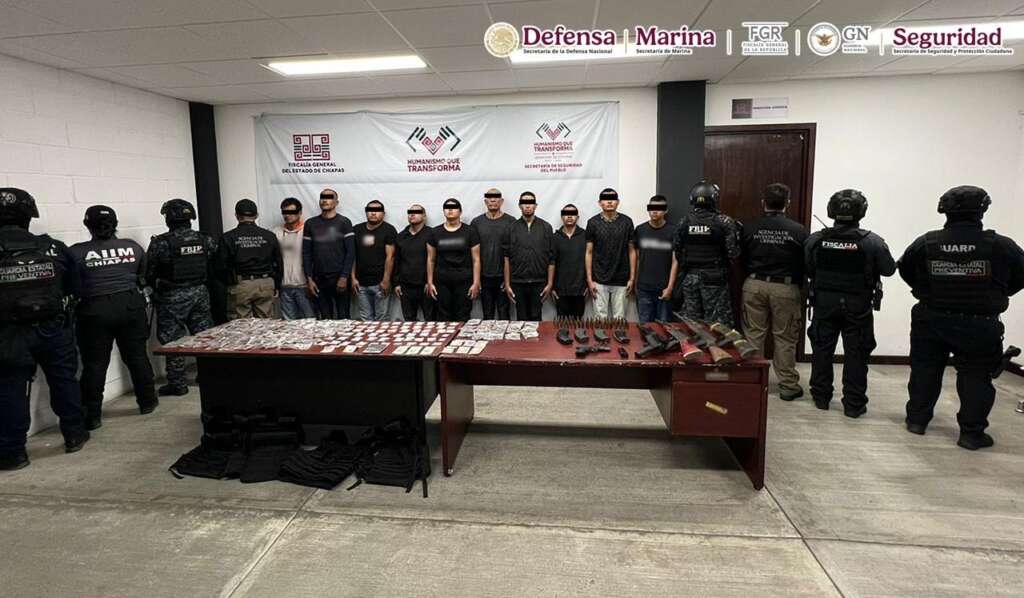 Chiapas., 08 de diciembre del 2025. Resultado del trabajo interinstitucional, en el estado de Chiapas, elementos de la Secretaría de la Defensa Nacional (Defensa), Secretaría de Marina (Semar), Fiscalía General de la República (FGR), Guardia Nacional (GN), Secretaría de Seguridad y Protección Ciudadana (SSPC), junto con Fiscalía y Policía Estatal, detuvieron a 12 personas vinculadas a un grupo delictivo, aseguraron armamento y dosis de droga.