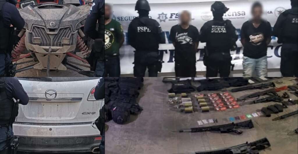 Además, se localizaron 90 dosis de hierba verde y seca, posiblemente marihuana, tres artefactos ponchallantas, equipo táctico diverso (cascos, camisolas, guantes, pasamontañas y placas balísticas), así como cuatro vehículos: una camioneta Mazda CX9 con reporte de robo vigente, una camioneta Toyota Hilux, un vehículo todo terreno Can-Am Commander y una cuatrimoto Yamaha.