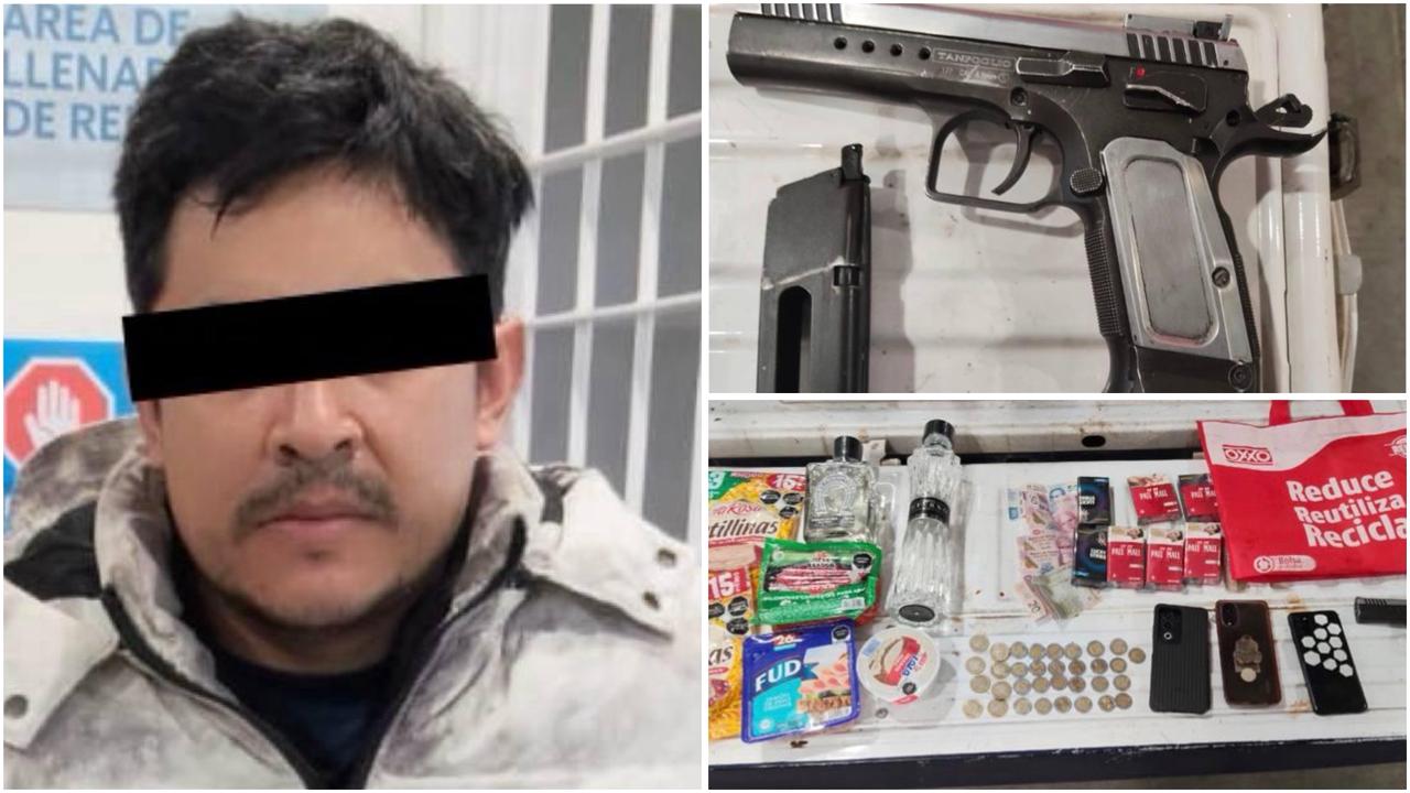Detienen a hombre por robo con violencia; recuperan efectivo, abarrotes y arma de utilería