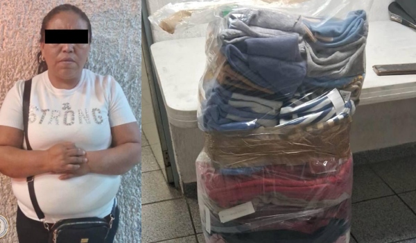 Unidades del sector acudieron al lugar y localizaron a la mujer que coincidía con la descripción. Durante la inspección, se aseguraron 83 prendas, en su mayoría suéteres, aparentemente robadas del comercio.