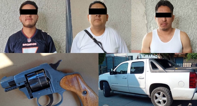 León, Guanajuato. Julio 23, 2025. El trabajo coordinado de la Secretaría de Seguridad, Prevención y Protección Ciudadana y la pronta reacción de la Policía de León permitieron la detención de tres hombres armados, quienes además fueron señalados por amenazas.