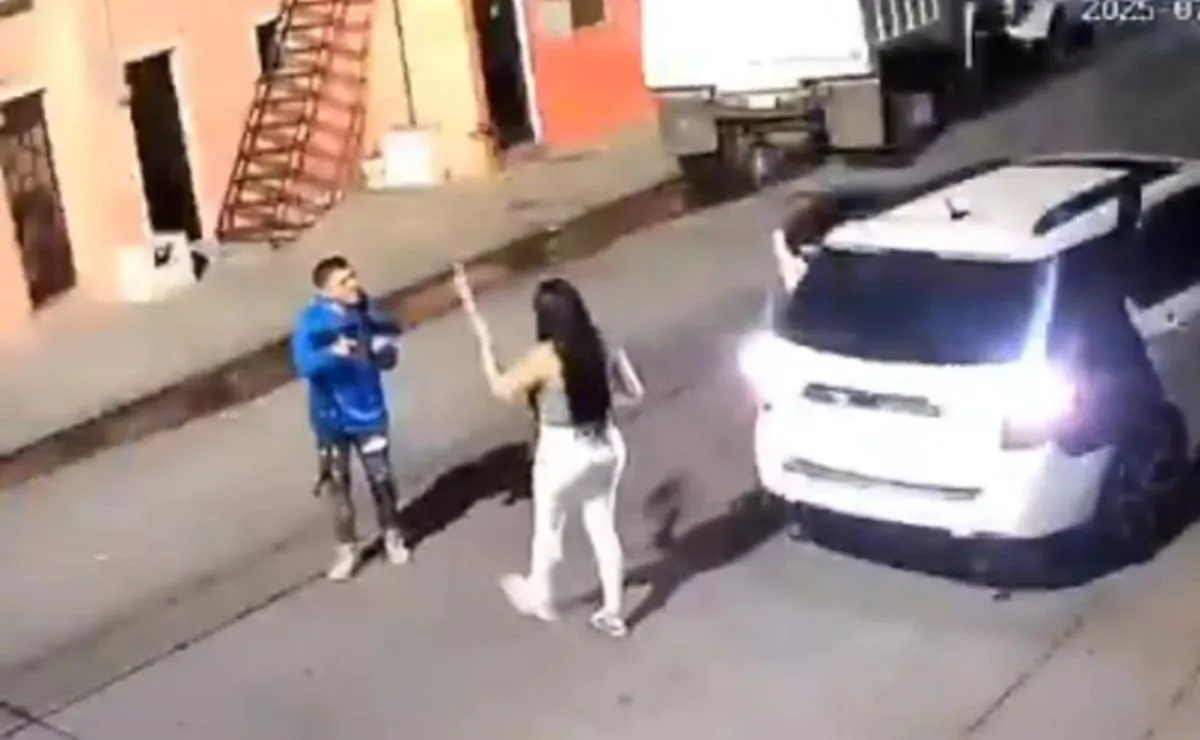 Una cámara de seguridad captó el momento en que la joven golpea la camioneta de su ex con un palo de escoba tras reclamarle que se fuera.
