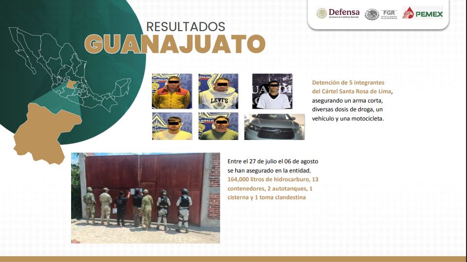 El secretario de Seguridad y Protección Ciudadana, Omar García Harfuch, destacó que, como resultado de la Estrategia Nacional de Seguridad, en las últimas tres semanas, del 18 de julio al 10 de agosto de 2025, se han detenido a 2 mil 458 personas por delitos de alto impacto, asegurado 901 armas de fuego y 12 toneladas de droga, además se inhabilitaron 65 laboratorios y áreas de concentración. Mientras que, desde el inició de la actual administración, de 1 de octubre al 10 de agosto, hay más de 29 mil detenidos por delitos de alto impacto, se han asegurado 14 mil 943 armas de fuego, 216 toneladas de droga, entre ellas 3.5 millones de pastillas de fentanilo y en 21 estados se han inhabilitado mil 262 laboratorios y áreas de concentración dedicados a la producción de metanfetamina.