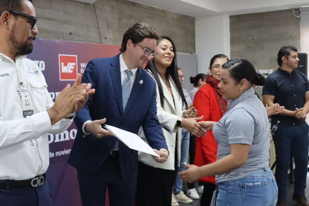Guanajuato, Gto., 17 de noviembre del 2025.- El Gobierno de la Gente, a través de la Secretaría de Economía entregó constancias a 11 mujeres de la empresa Würth que concluyeron con éxito su capacitación en Ensamble y Manufactura de Piezas Automotrices, a través del programa Bécat.