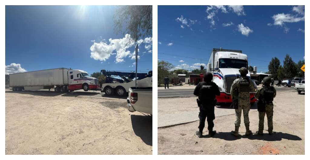 Las autoridades aseguraron dos vehículos; un tractocamión marca Kenworth , modelo 2016 con reporte de robo vigente y un impacto de arma de fuego en el cofre, y otro color azul con caja seca.