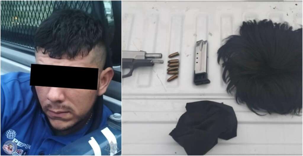 Al realizarles una revisión, se les localizó un arma de fuego corta tipo escuadra calibre 9 mm, un cargador con seis cartuchos útiles del mismo calibre y una peluca.