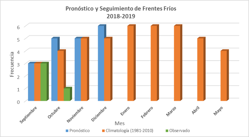 El Servicio Meteorológico Nacional (SMN) dio a conocer la perspectiva de la temporada de frentes fríos 2018–2019. Se espera que desde este mes y hasta diciembre de este año se presenten 16 frentes fríos, cifra superior al promedio, que es de 14. Los frentes fríos pueden generar lluvias y caída de granizo