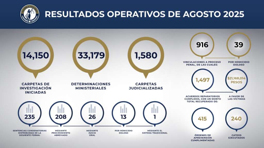 Guanajuato, Gto., 03 de Septiembre del 2025.- La Fiscalía General del Estado de Guanajuato (FGEG) informa los resultados obtenidos durante el mes de agosto de 2025, reflejo del trabajo sistematizado, metodologizado y coordinado de las distintas áreas que integran esta Institución. Estos logros evidencian el avance en la persecución penal, el acceso a la justicia y la atención a las víctimas con un enfoque humanista y cercano.
