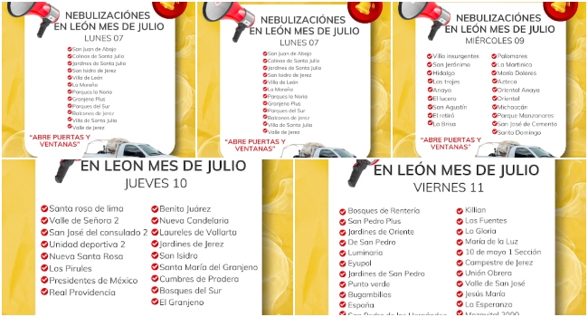 León, Guanajuato Guanajuato. 8 de julio de 2025.– La Secretaría de Salud con la Jurisdicción Sanitaria VII anunció una serie de nebulizaciones por diferentes áreas del municipio de León.